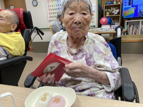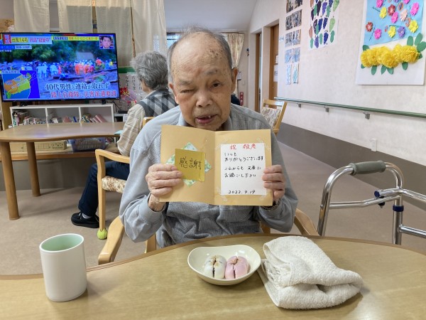 紅白のお饅頭と手作りの敬老カードを感謝を込めてお渡ししました。