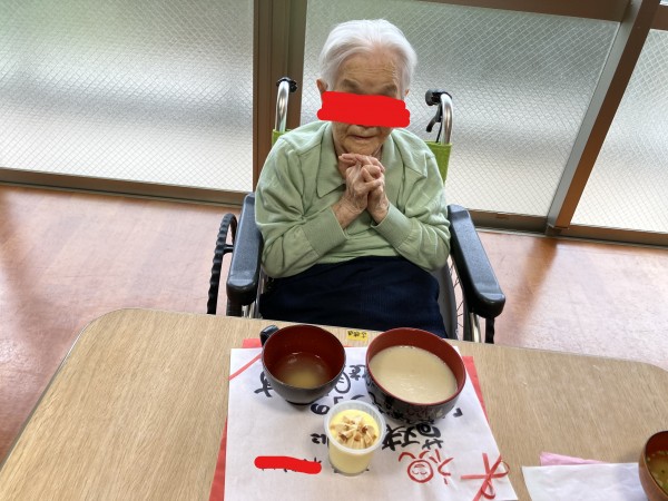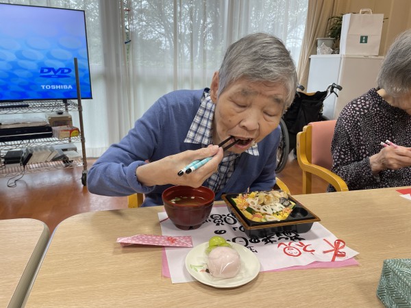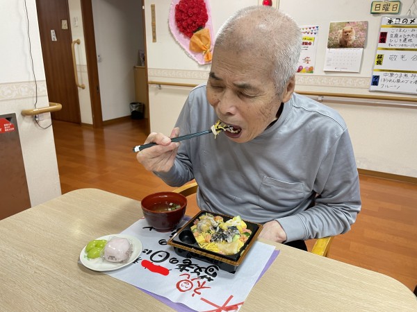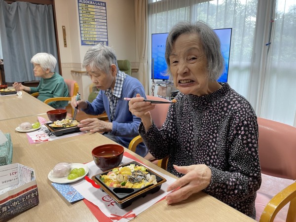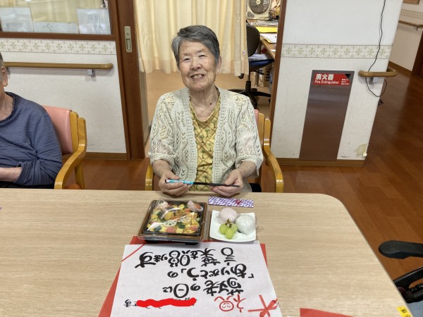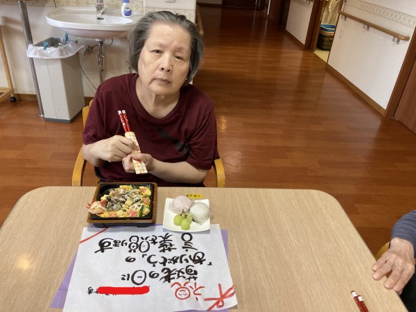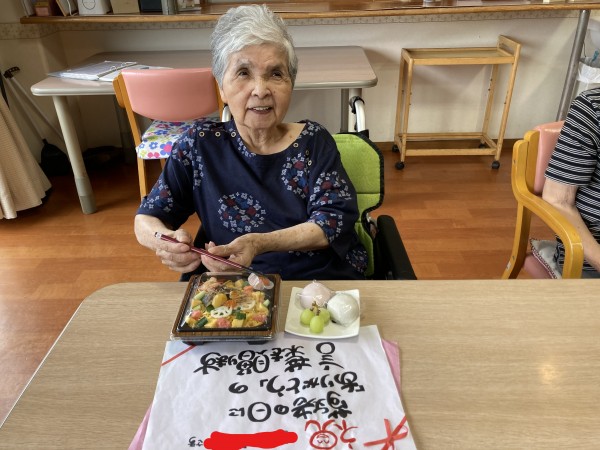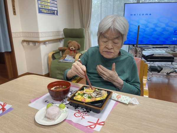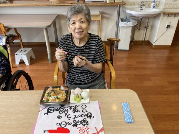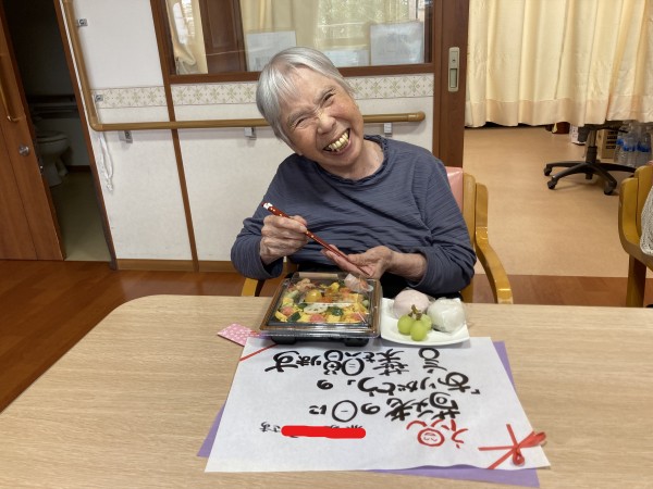 お祝いのお弁当を見て利用者様は、こんな豪華なの久しぶりね!と笑顔で喜ばれてました。