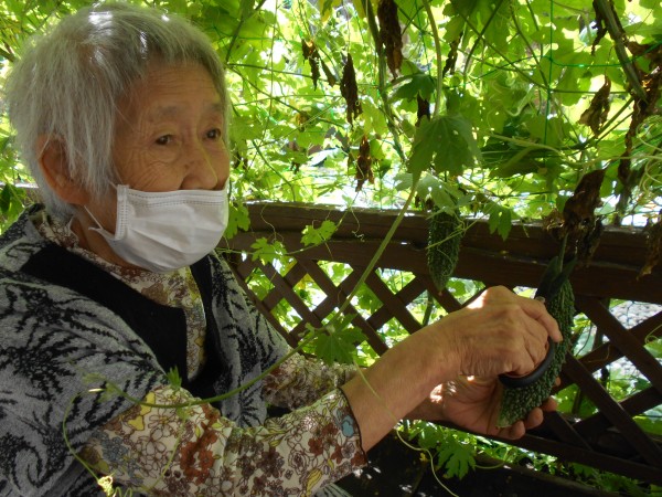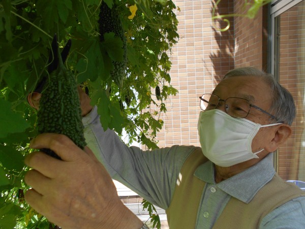 先日、ホームの中庭で栽培している野菜を収穫しました。
