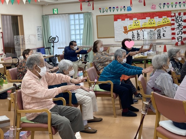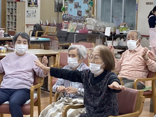 体操のお時間です、皆様頑張って体を動かしましょー(体操前の風景です)