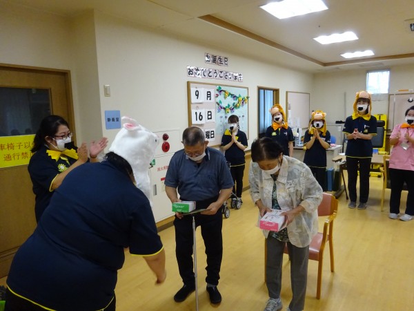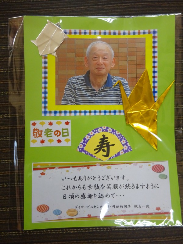 敬老会イベント終了のあいさつでは、敬老の日という事で職員より写真付きのメッセージカードと粗品のプレゼントをさせていただきました。