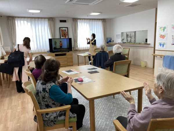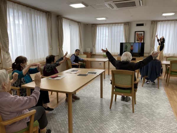 毎日午前、午後に、各ユニットでみんなで声を出し合い楽しくからだを動かしています。あんしん体操、リズム体操、口腔体操、ヨガなど様々なメニューがあり、色々楽しく行っています。初めの頃は利用者様も恥ずかしがったり動きについていけなかったりしていましたが、今では、音楽がかかると、自然に腕が動いていたり、画面の先生方の動きにしっかりとついていき元気いっぱいです。継続は大切ですね。