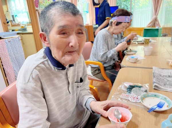 ホーム長の手作りやきそばとかき氷(いちご・メロン・ブルーハワイからお好きな味を選んでください!)をお出ししました。