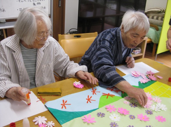 こんにちは! グループホームみんなの家・あきがせの介護ブログです! よろしくお願いいたします。 今日はコスモスの貼り絵をしているご様子をお知らせいたします!!