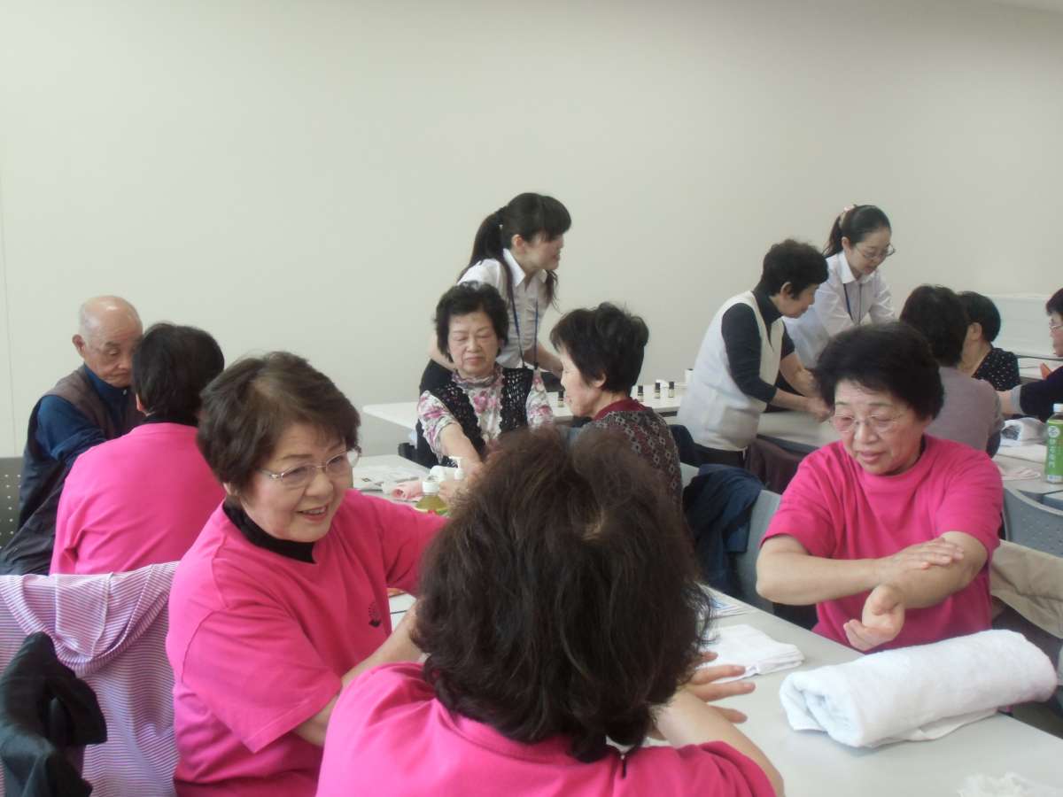 香りの選び方、安全の為の注意を聞いた後は、参加者同士でハンドマッサージ。
