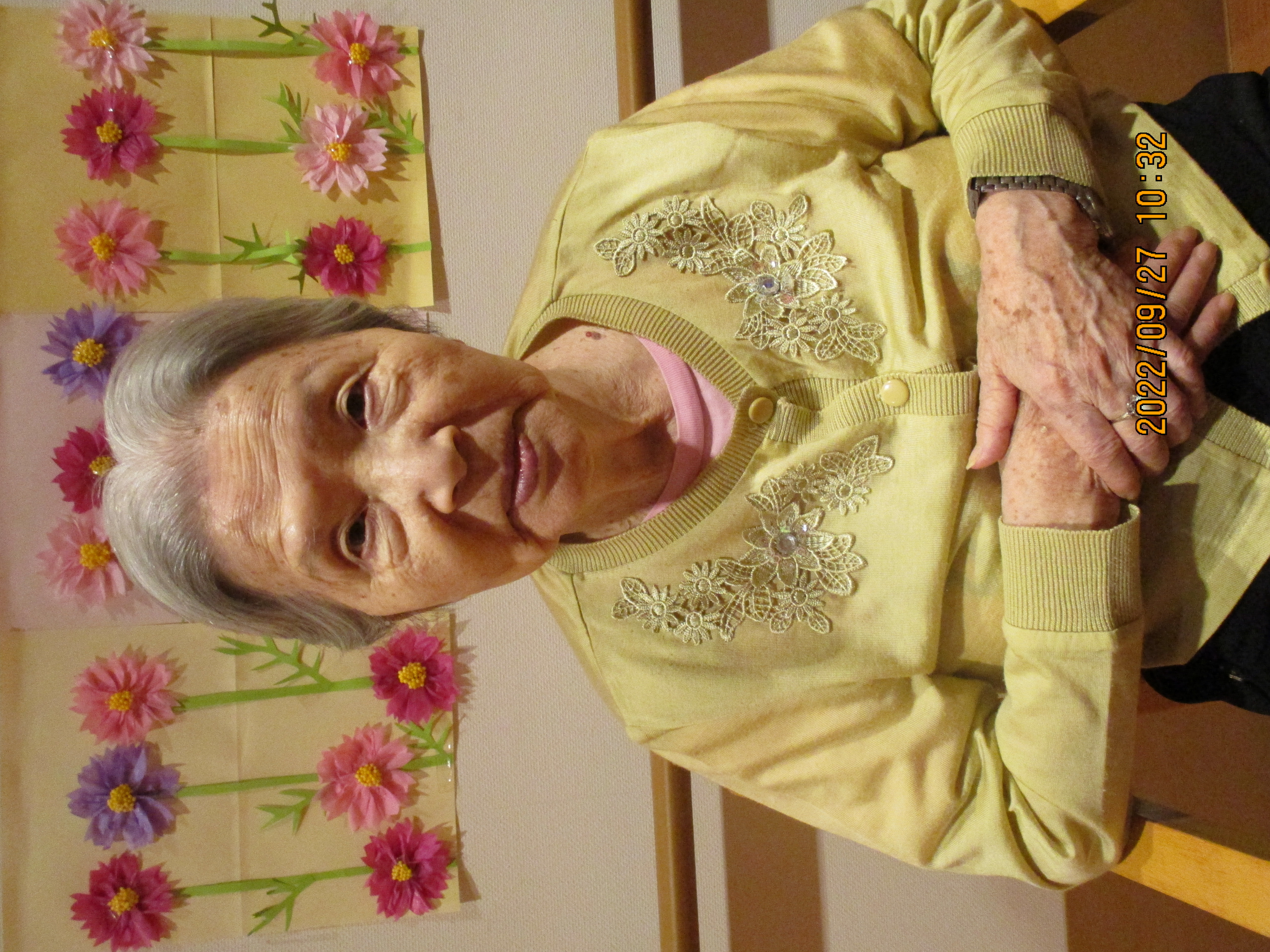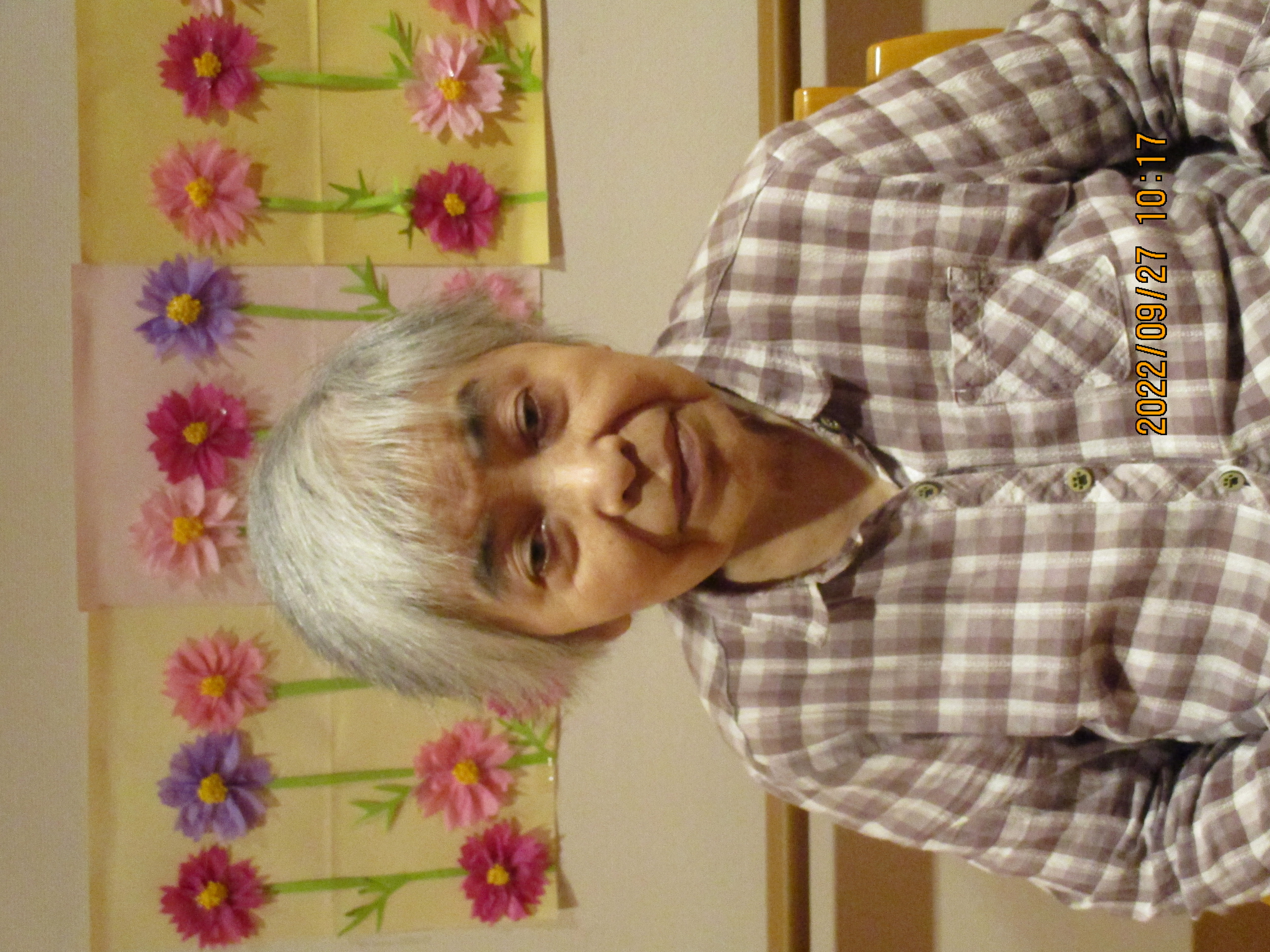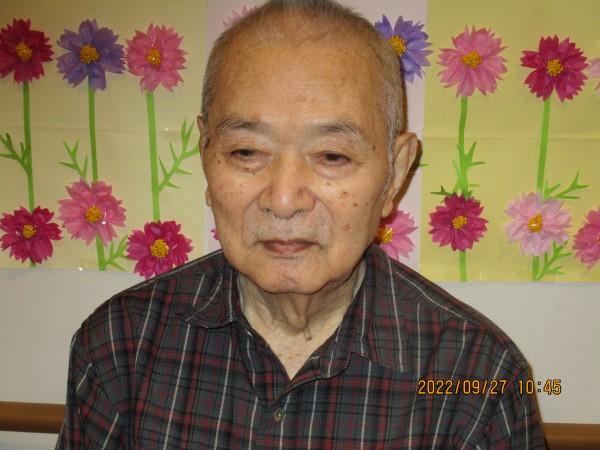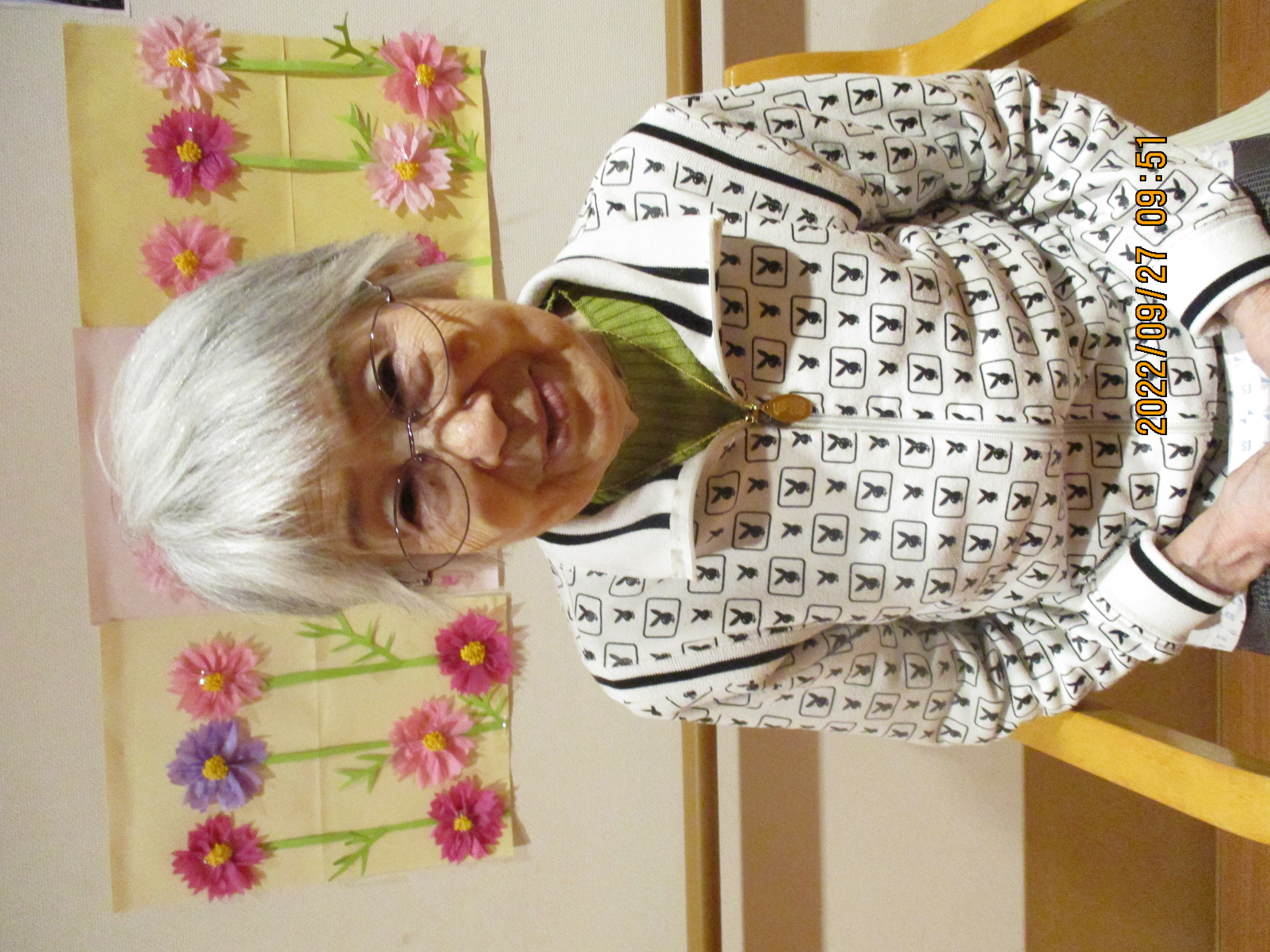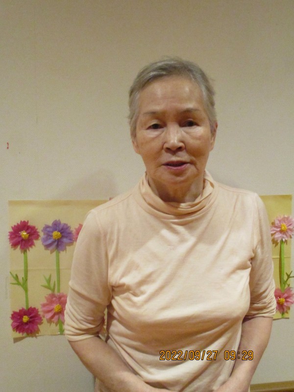 浴室で、髪の毛を切った後は、コスモスをバックに記念撮影を行いました。