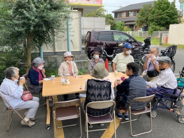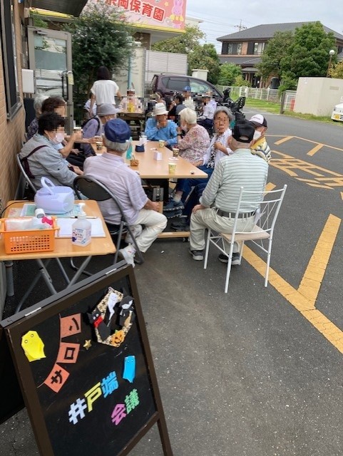 気持ちの良い晴れ空の下で、水分補給を行いながら、「お買い物券はもう使った?」などなどお話しました。