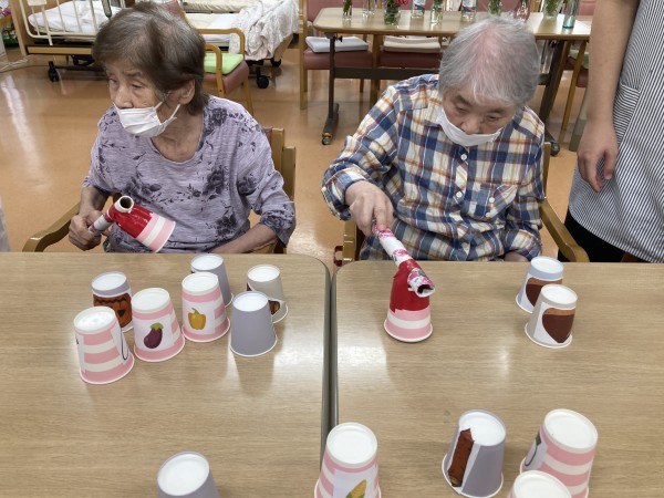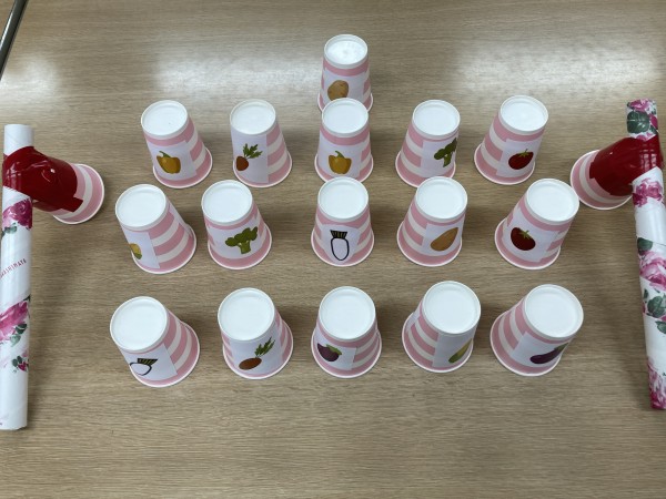 野菜を採るということで、その野菜は「コップに貼った野菜を採る」ということとなります。とは言え、ただ採るだけではちょっと物足りないので、もぐらたたきゲームで使うような棒をご用意して行いました!