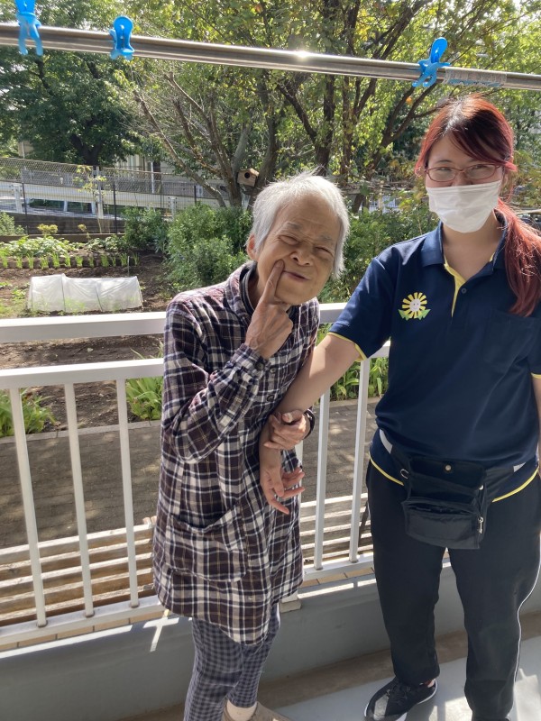 秋晴れでしたので、1階入居者も外へ外気浴に出てみました。