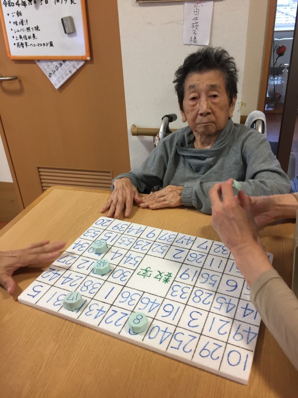 スタッフが言った数字をボードに書かれている数字を見つけて駒を置いていきます。