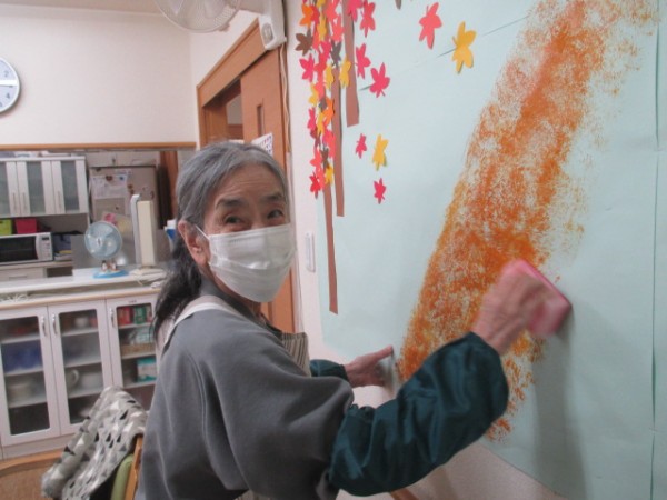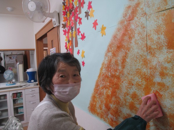 スポンジに絵の具をしみこませ・・・ポンポンと・・・モミジ街道製作中です!(^^)!さてどんな作品が出来るか楽しみです。