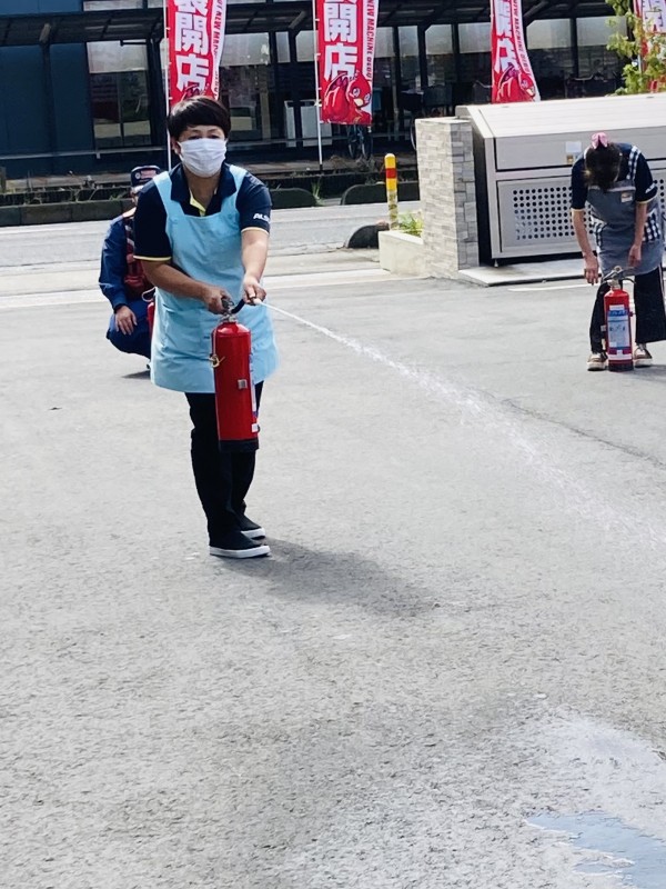 無事に避難完了したら職員による水消火器を使った訓練です。