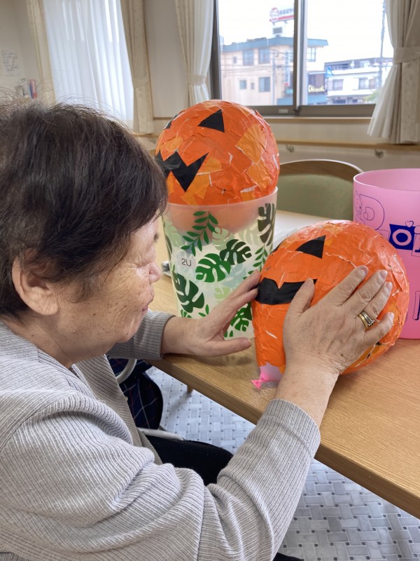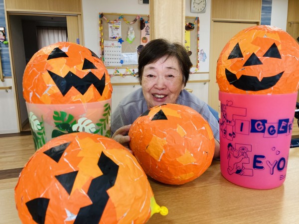 カボチャのお化け「ジャックオランタン」作りは順調にすすんでいます。毎日少しずつ皆さんで貼り絵をしていき、いよいよ顔が完成です♪