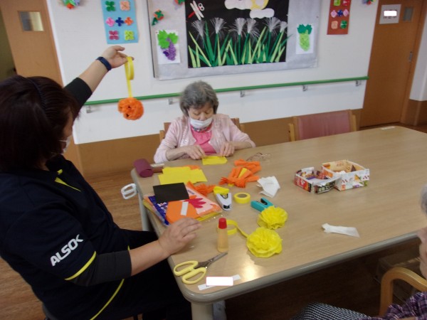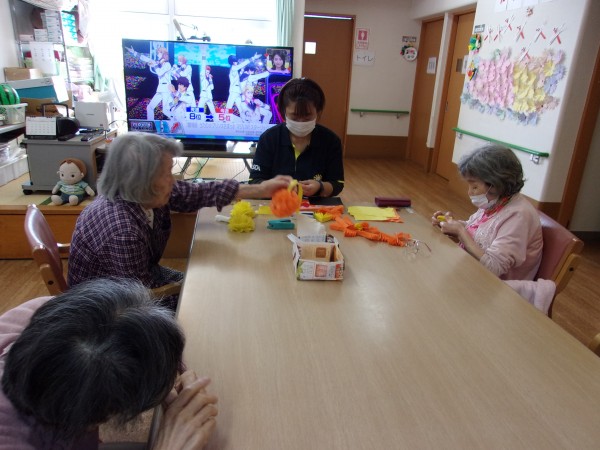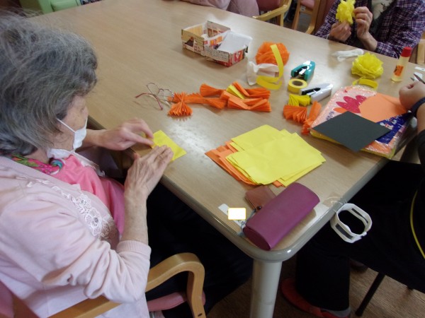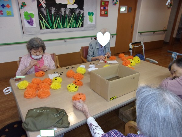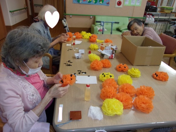 今日のレクリエーションは、おはな紙を使いハロウィンの飾り作りをしました(^o^)丿