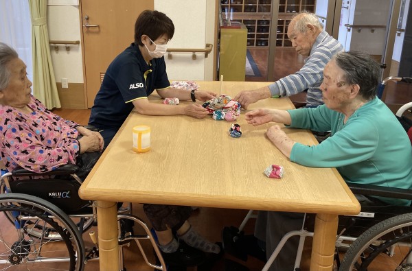 お箸を倒さない様にお手玉を重ねるゲームをレクリェーションとして行いました!