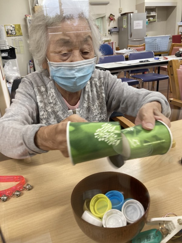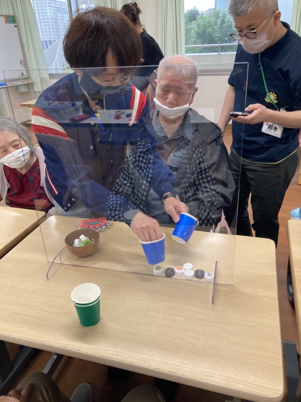 ボトルのキャップを紙コップ挟んで、お椀に入れていきます。時間制限の中、何個お椀に入れられるかの競争です!!!