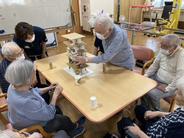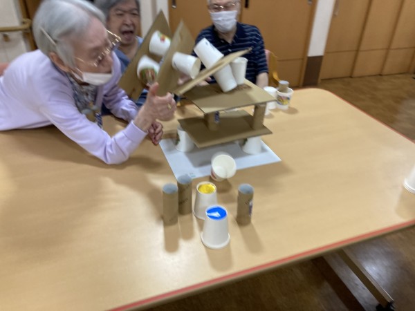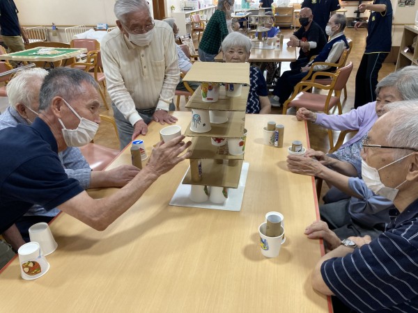 紙コップをタワーのように積み上げ、紙コップを1個ずつ崩れないように抜き取るというバランスゲームを行いました♪
