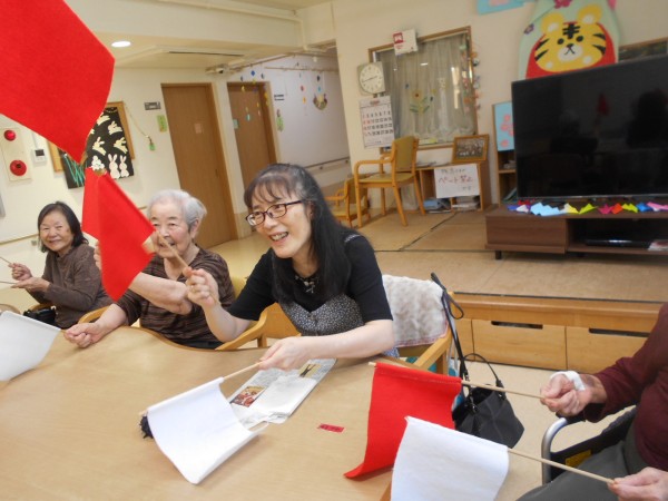 午後のレクリエーションは皆さんの大好きな紅白旗揚げ体操です