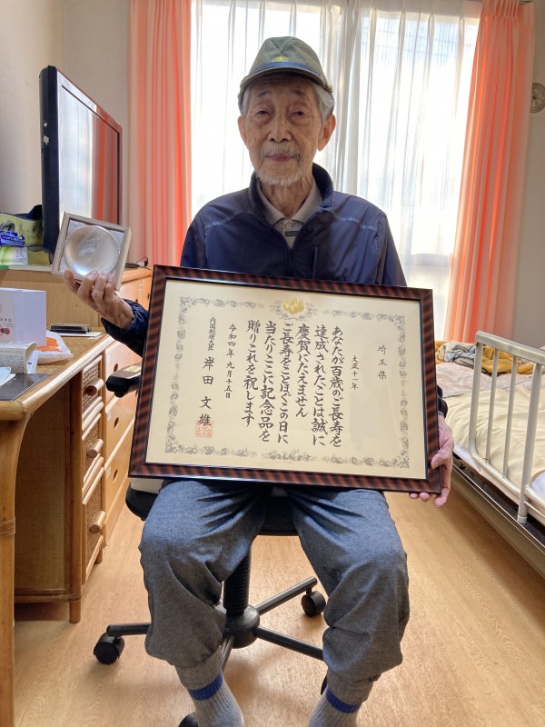 百寿のお祝いの賞状と記念品が贈られてきましたので