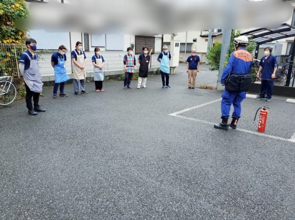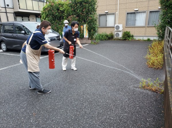 水消火器の訓練は川崎久地、川崎久地2の職員合同で実施しました。