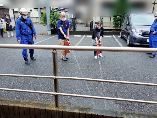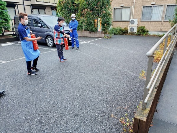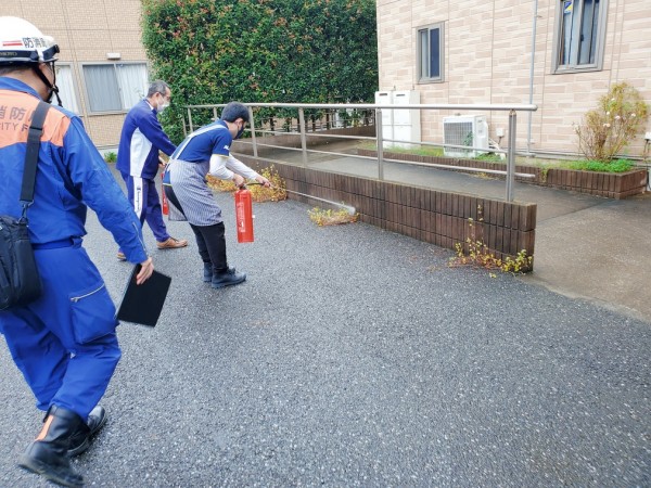 利用者様の避難完了後、少しの小雨は降っていたのですが、水消火器(消火器)の使用用法