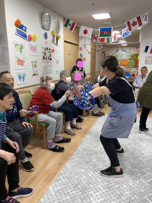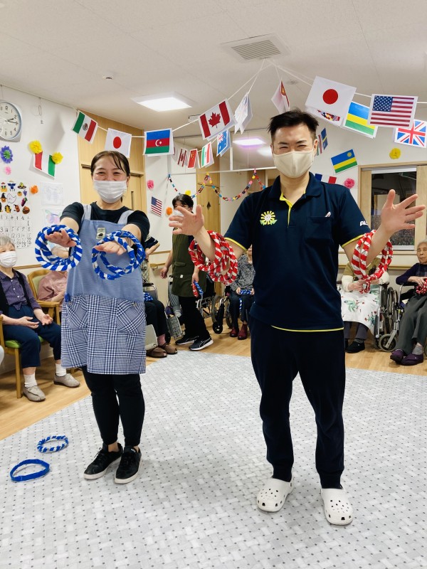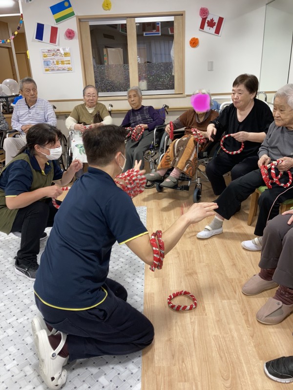 職員の手足に向かって輪を投げます。入っても外れても大歓声❗️どちらが多く入っているでしょうか⁉️