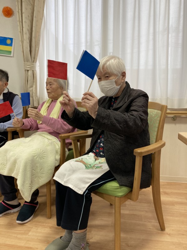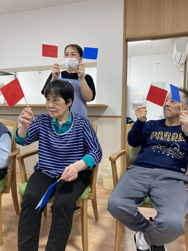 赤と青の旗を持ち、リズムよく旗揚げをしていきます♪間違えずに出来るでしょうか?