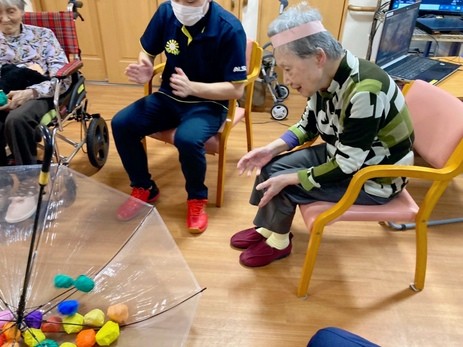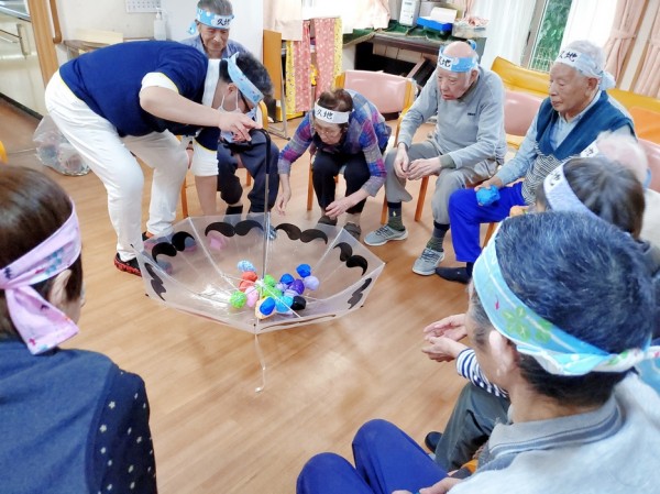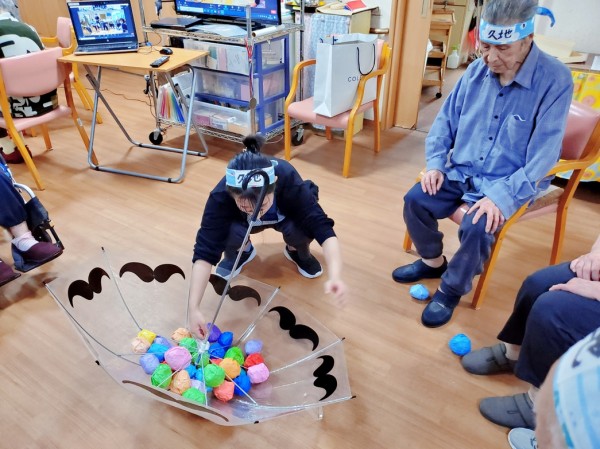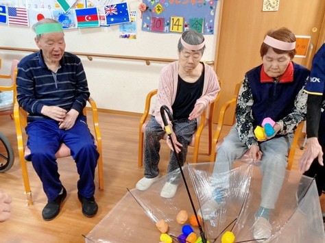 この種目では的(傘)めがけて玉を入れるゲームです!