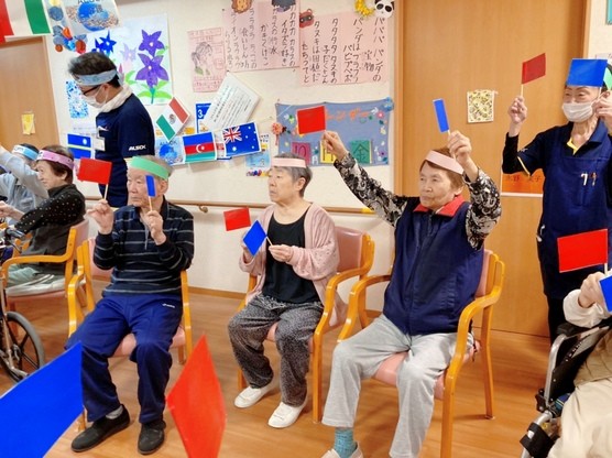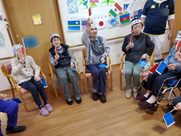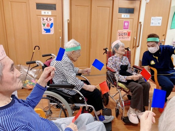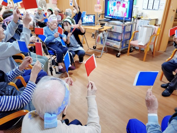 をお持ちいただき、テレビの中の先生の掛け声に合わせて旗をあげるゲームです。
