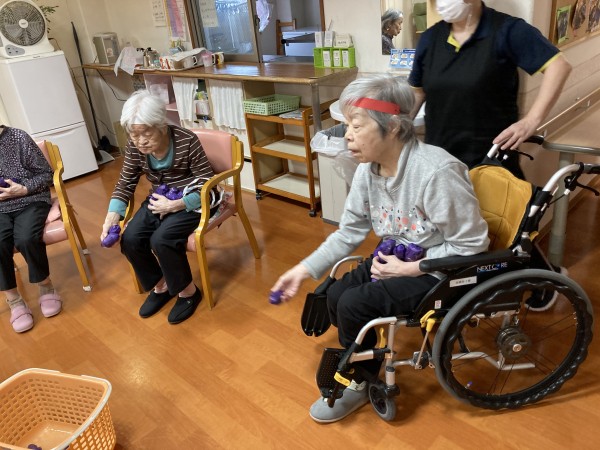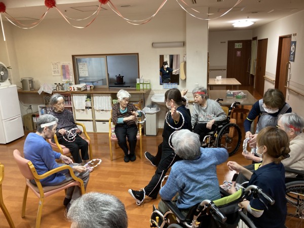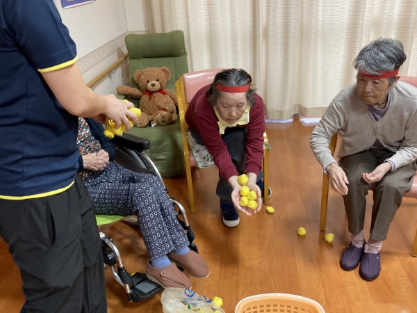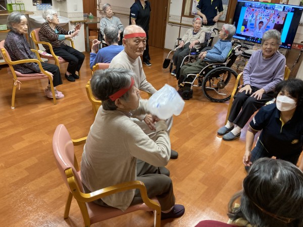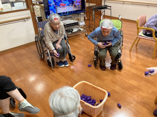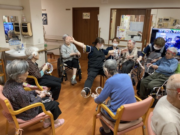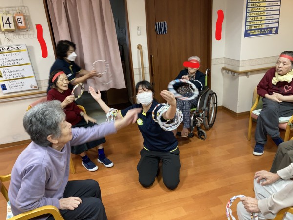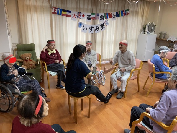 職員と利用者さんと新聞紙で作った輪っかを職員の手・足に利用者様が投げ入れます。
