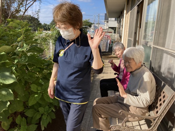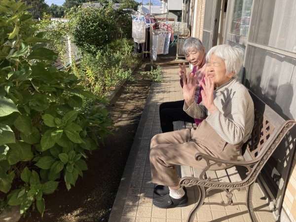 先日雨が続いている日のちょっとした晴れ間にフロアで仲良しのお二人で外へ出てみました。
