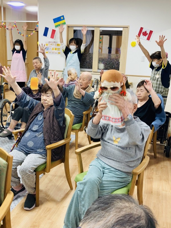 大きく口を開けて「あ、い、う、え、お」皆さん大きな声が出ています!手拍子、足踏み、手足の体操‥と盛りだくさんです。
