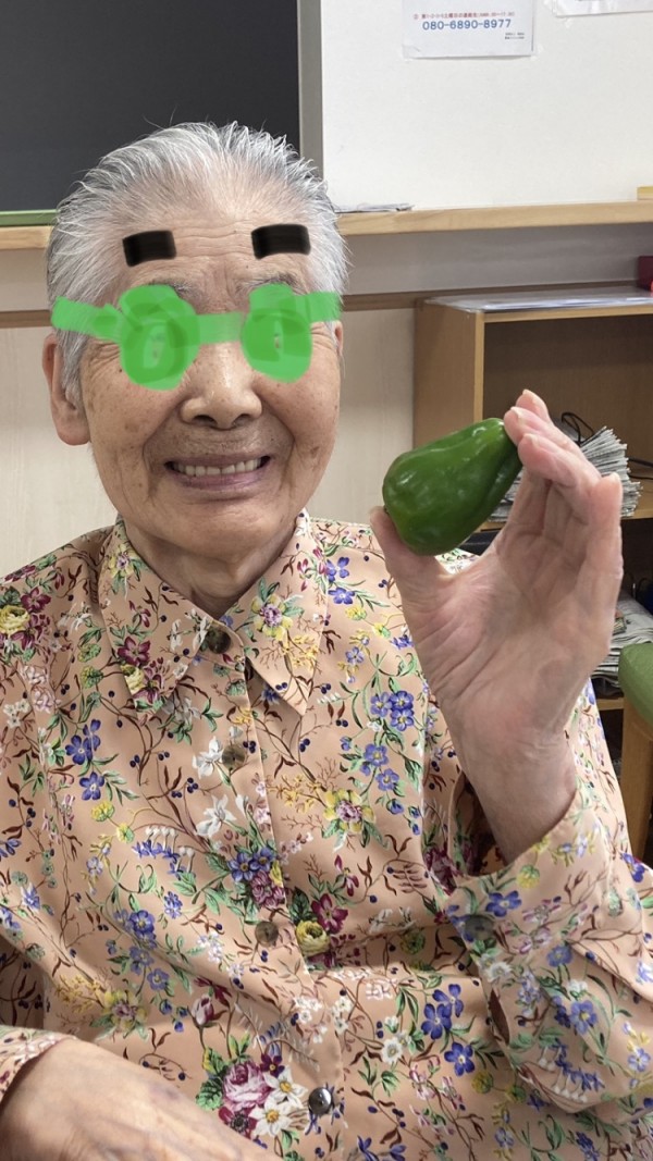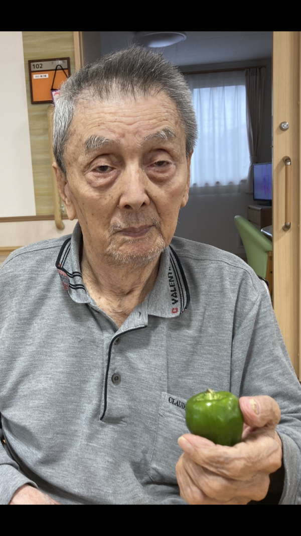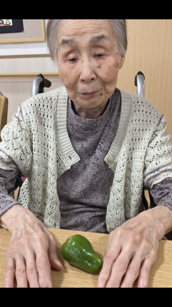 1個1個、手に持って「ハイ、ピーマン」「可愛いわね」「苦いかなぁ」「何作ろう?」ご利用者様の心の声が聴こえるようですね❤️