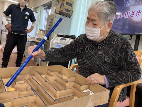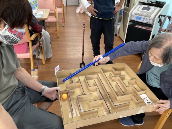 段ボールの中に迷路があります。スタートにピンポン玉を置き、棒でゴールまで誘導し、何秒かかったか競うゲームです。さてさて、何秒かかるかしら・・・・・。