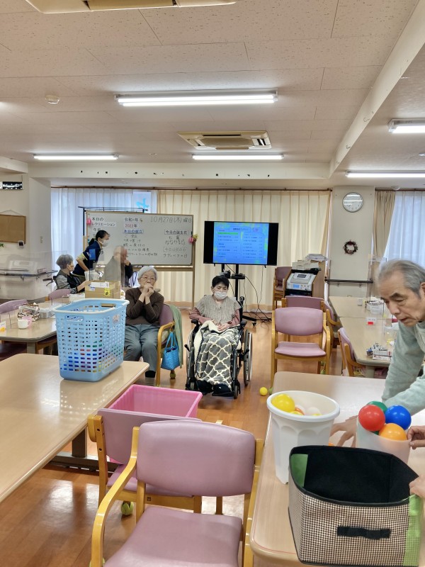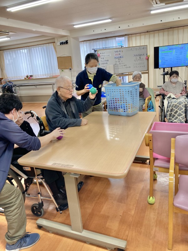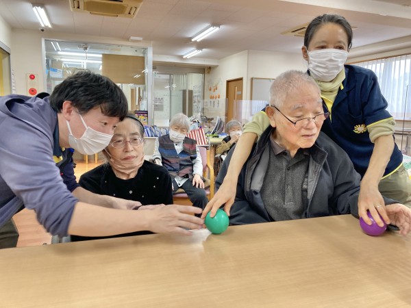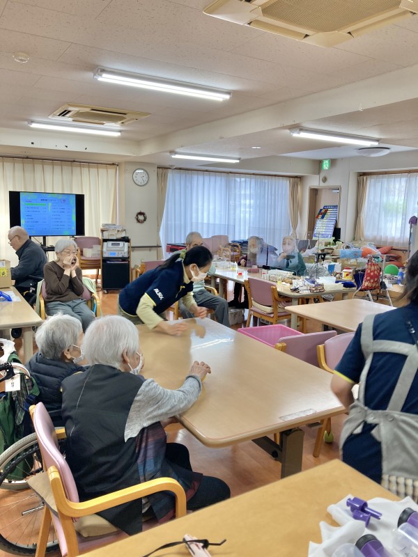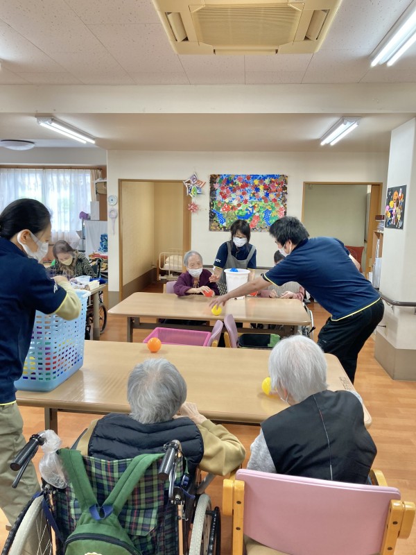 今日は、「おひねり」というレクです。本来、ピンボールに紙で丸めて、おひねりを作ってするのですが
