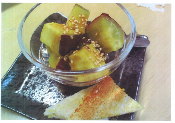 サツマイモにみたらし餡がとろっとのって、上からかけたゴマが香ばしいデザートです。その横に、ひっそりと柚子で香りをつけたトーストが添えてあり、これもまたみたらし餡によく合います。優しいお味で、皆様にも好評でした。