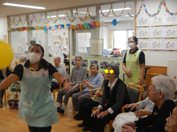 輪の中の職員と外の職員も協力して、何とか風船を落とさずに繋ぎました。