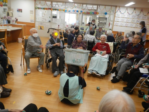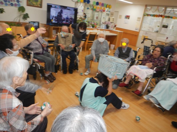 輪の中の職員のカゴ目掛けて1投・・2投。