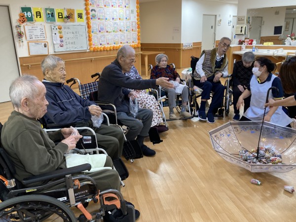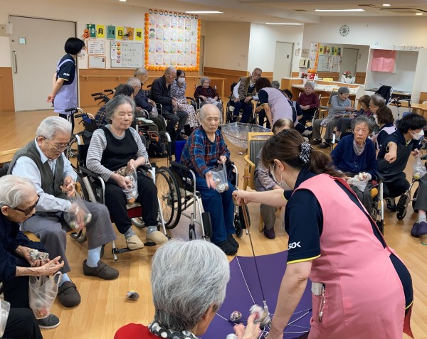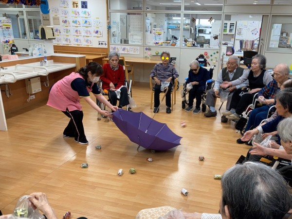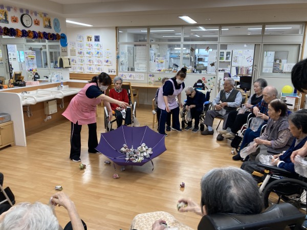 玉を拾う職員、投げるご利用者様と、傘に大量の玉の雨を降らしリベンジ成功!