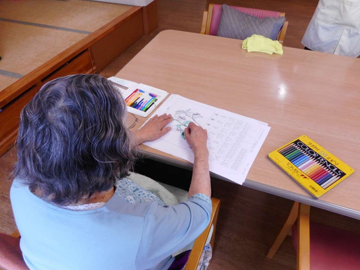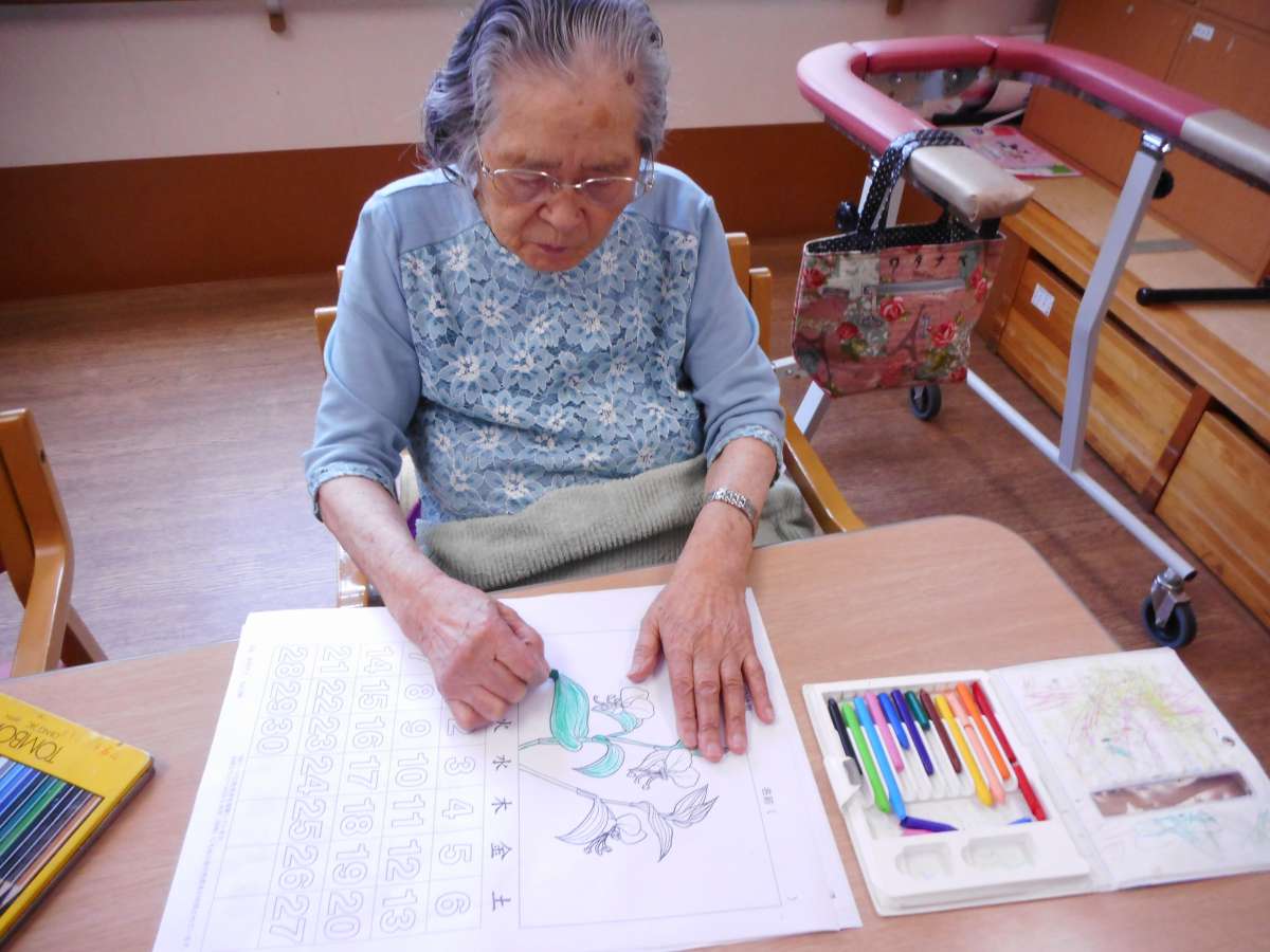 一生懸命にM様が室内レク〈カレンダーの塗り絵〉をされているところですね♪