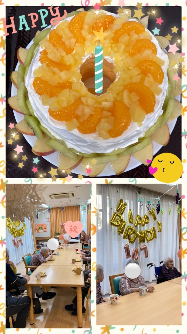 職員手作りの美味しいケーキでお祝いです!大きな写真にちょっとビックリされ(*'ω'*)皆様からのお祝いのお言葉に喜ばれておられました♡