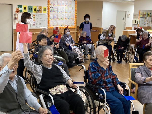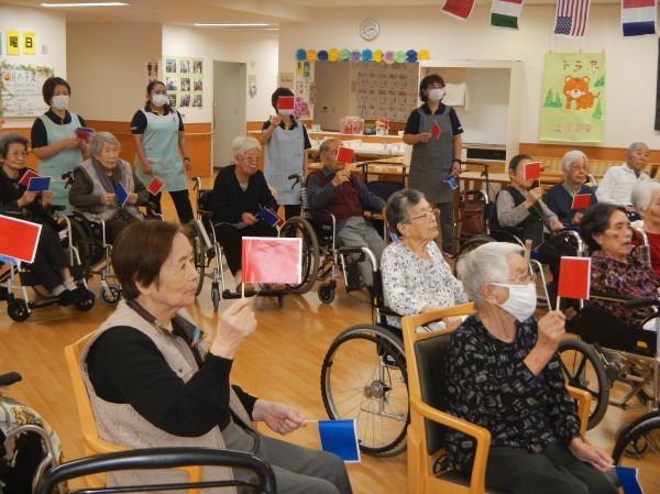 おなじみの「赤上げて!」「青下げて!」と、トレーナーの声に合わせて旗を上げ下げ。