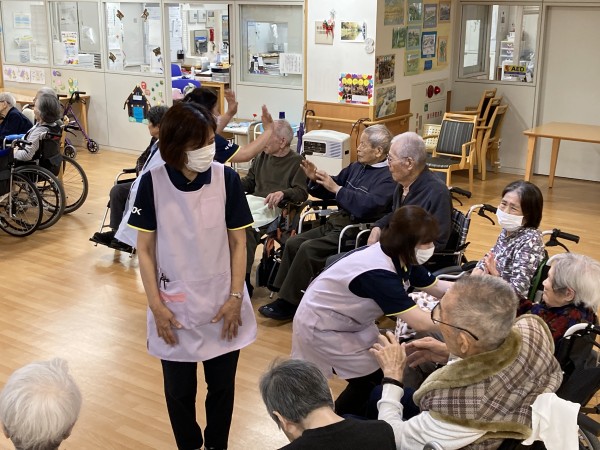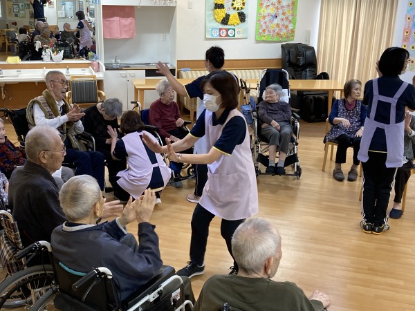 ご利用者様はその場で体を動かすも、職員は輪の中を音楽が終わるまで回り続けました。