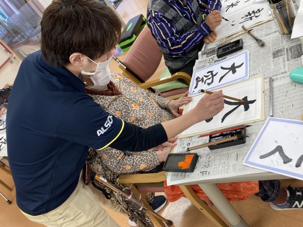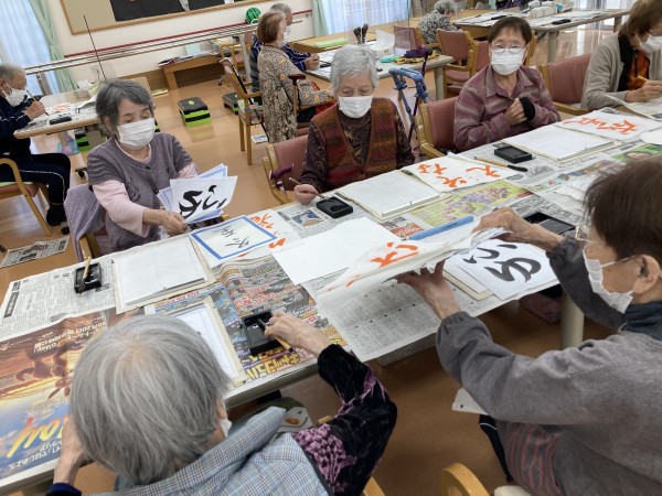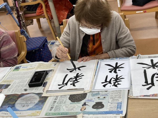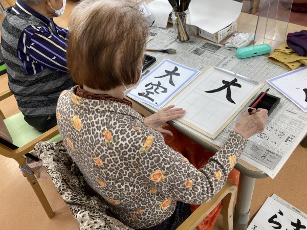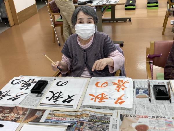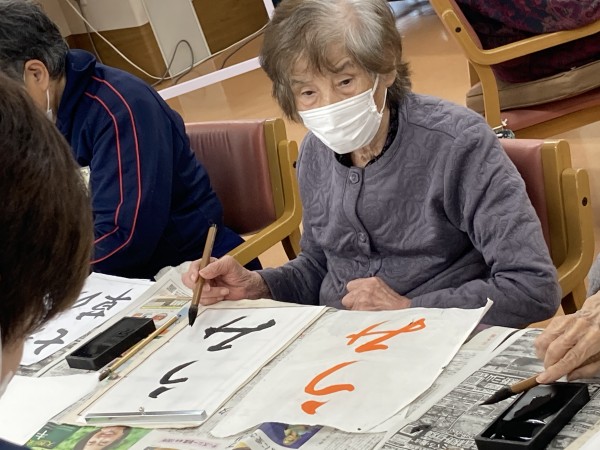 本日の遊蓮田は「書道教室」になります。書道になると皆様すっかり夢中になって書かれるので、とても良いことです。人によっては、学校以来に書く方もいらっしゃるぐらいなので、ここでその時の思い出を振り返りながらやっていただきます♪