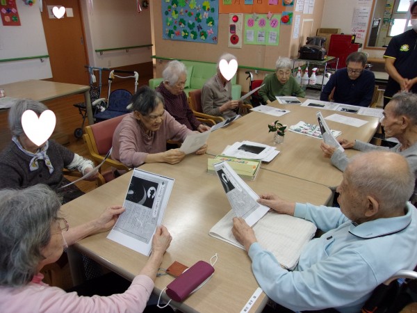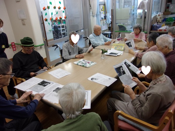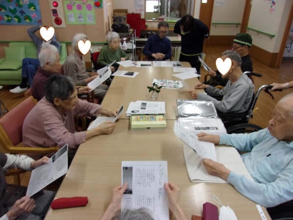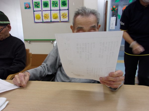 歌集を見ながらの合唱です♪大きな声で歌いまいた。上を向いて歩こうを♬