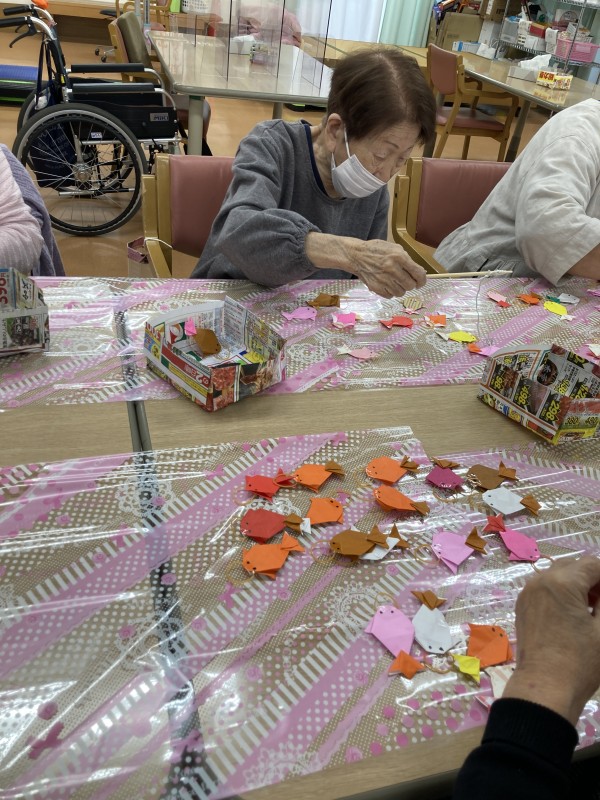 やり方としては、テーブルの方に簡単な池(っぽい)をご用意して魚釣りとなります。ただいつもの長い釣り竿では流石に釣るのは難しいので割りばし式釣り竿をご用意しました♪
