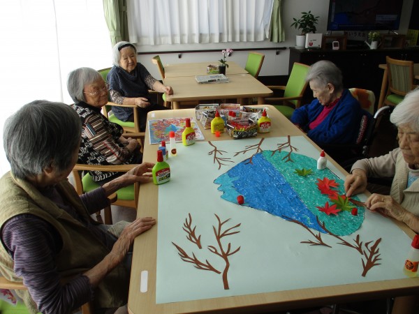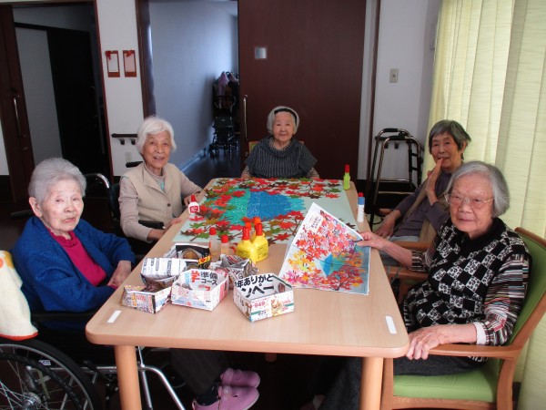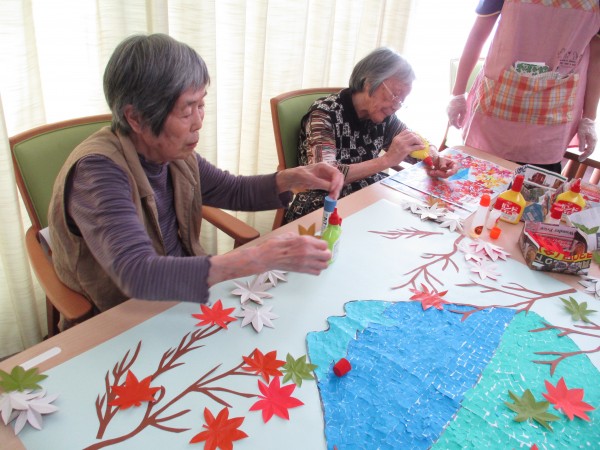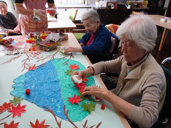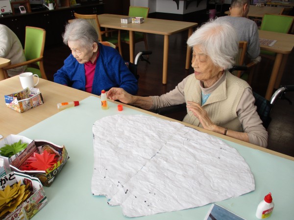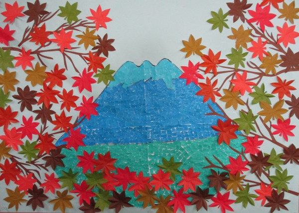 もみじをペタペタ貼って見事な(手前みそですが)富士の完成です。
