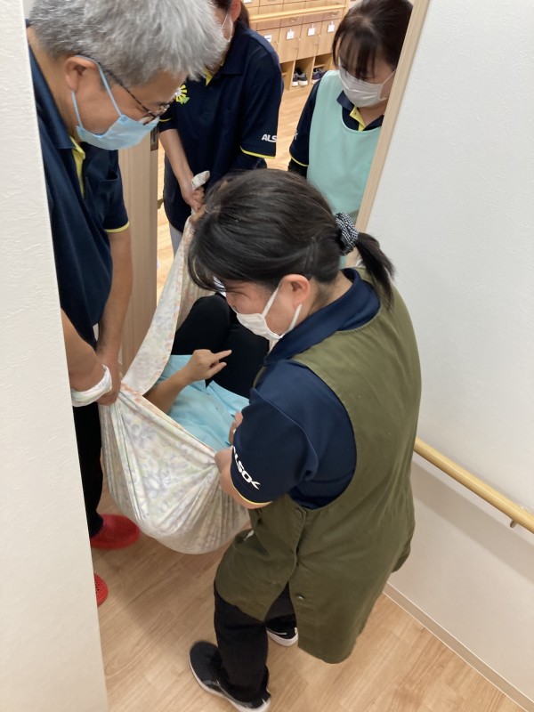 11/12(土)水害時避難訓練を行いました。利用者様が安全に避難出来るよう、職員が冷静且つ迅速な行動がとれると共に、職員、利用者様の水害に対しての意識を高める事を目的とした訓練です。