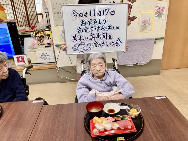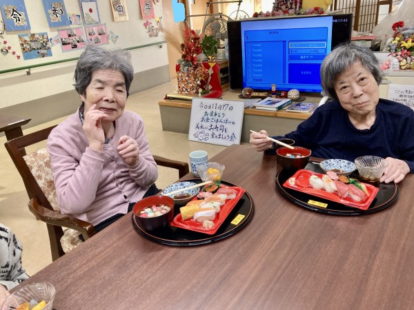 昼食では「握り寿司(デザート付)」を おやつの時間には「プリン」を