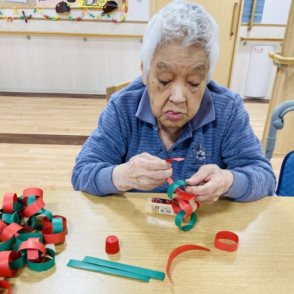 クリスマスカラーの緑と赤で輪飾りを作成中、真剣です‼️